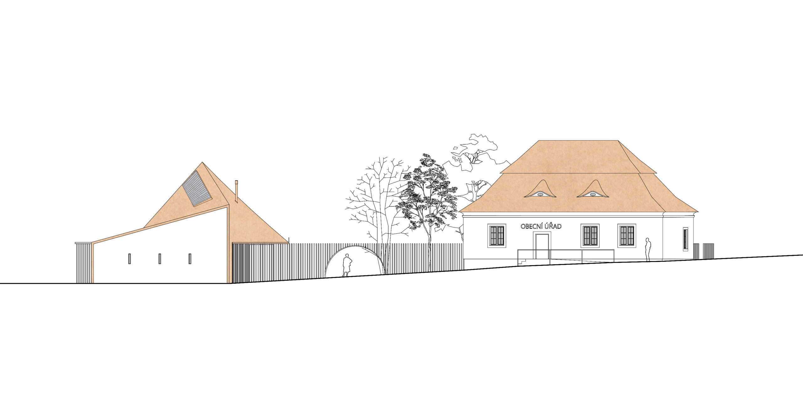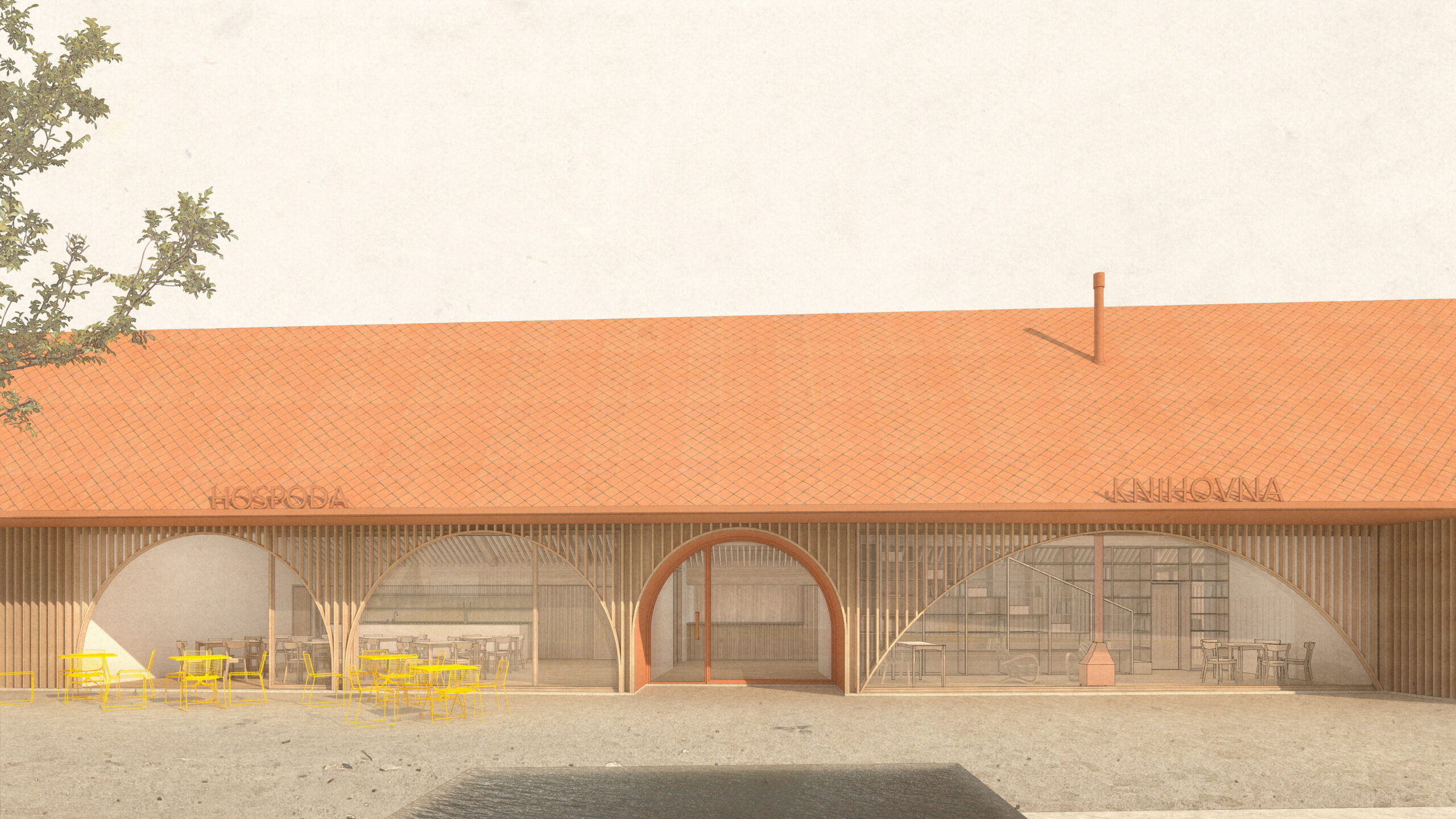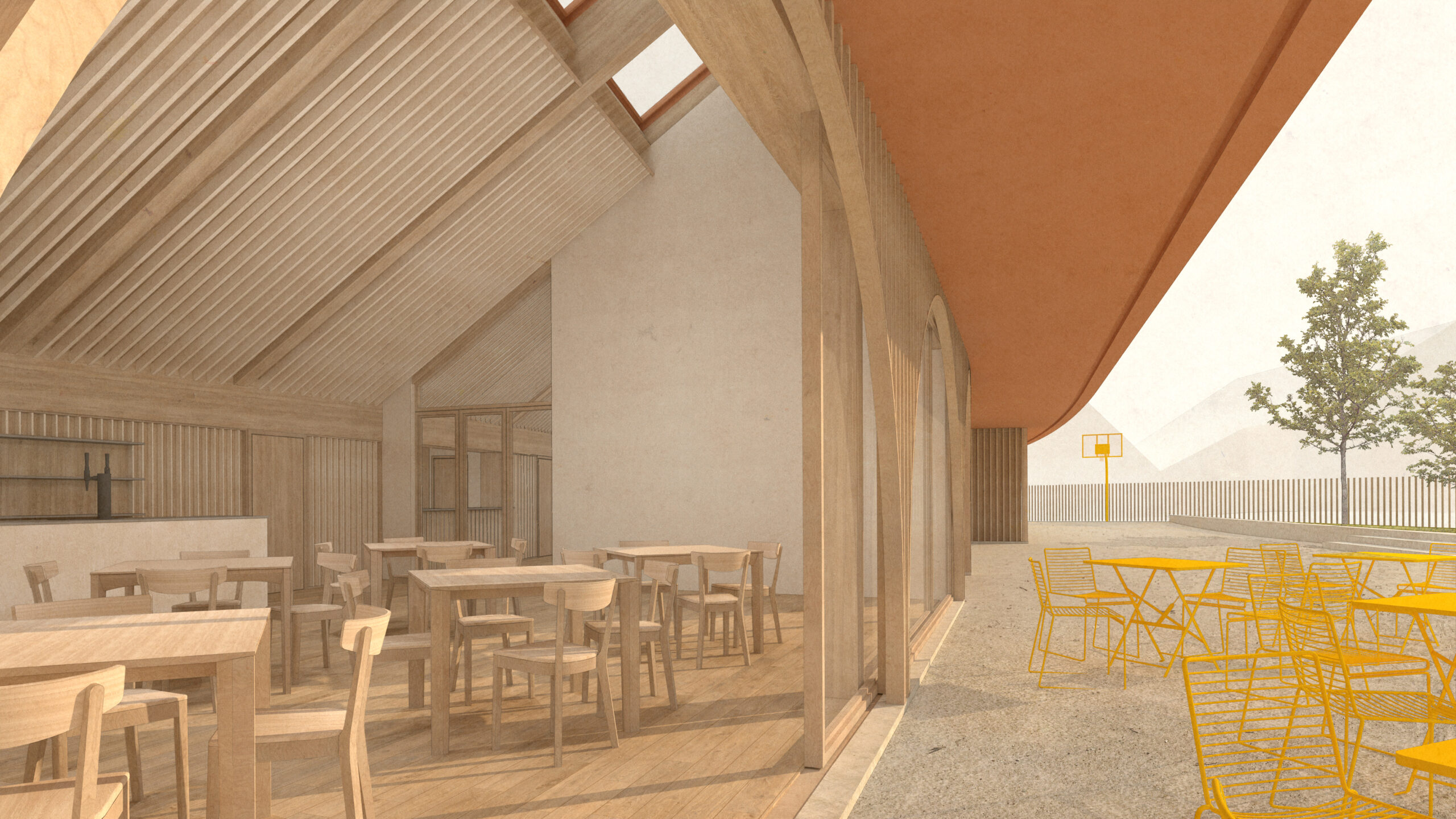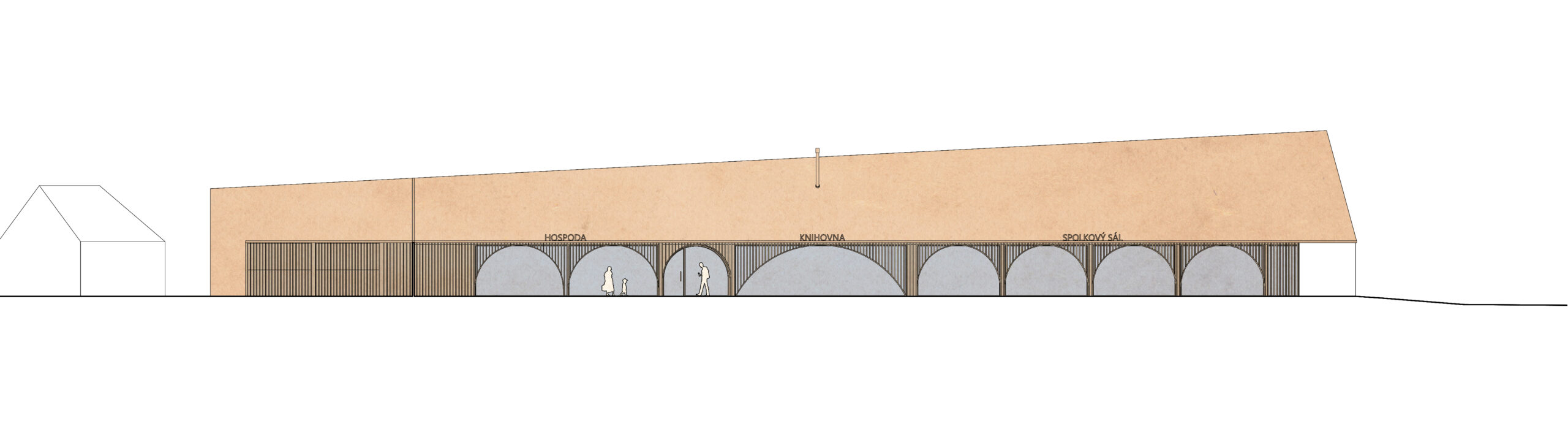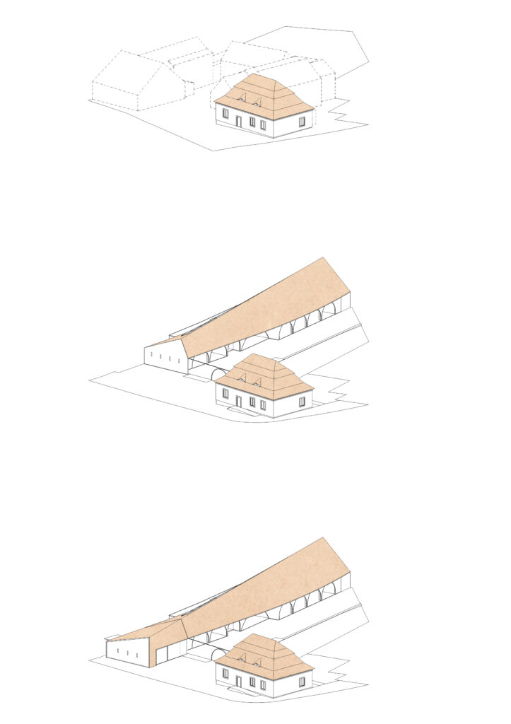The façade then emerges as a transition space, a filter, that connects both realms (interior and exterior).The large glass windows can completely open when the weather allows it or the occasion requires it. The roof protects this transition space, and the wood lamellas filters the light. The arches are not part of the construction logic but rather part of the public building language, to differentiate this building from the private houses in the village. The wood lamellas of the façade turn to become the entry gate and the fences that defines the pedestrian plaza and gardens.