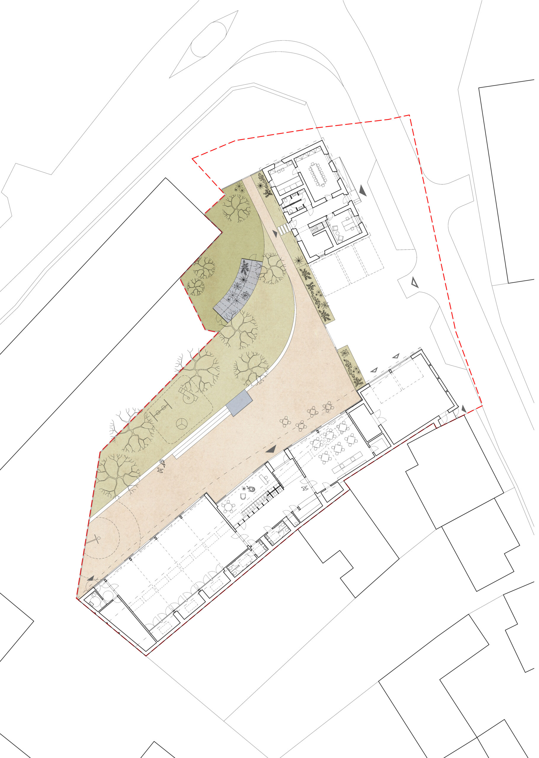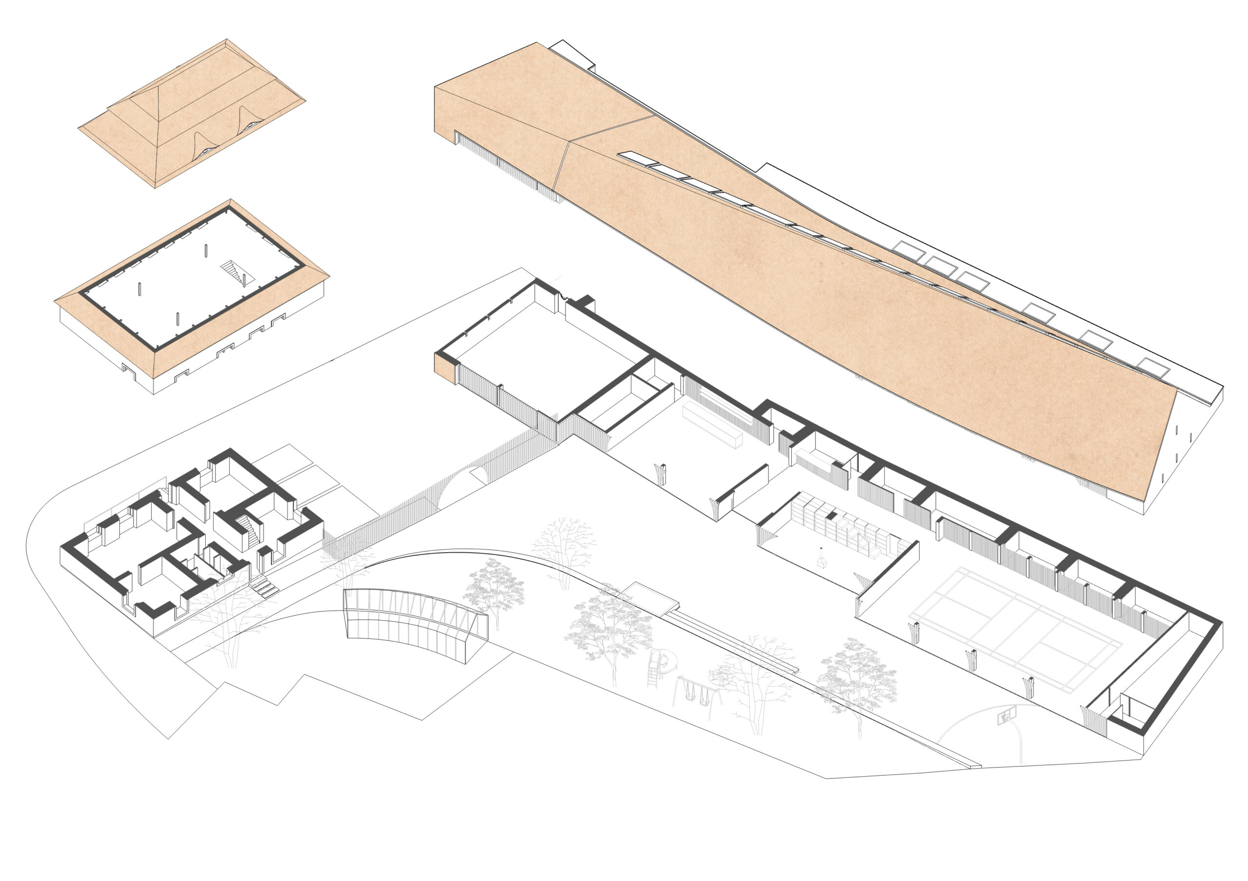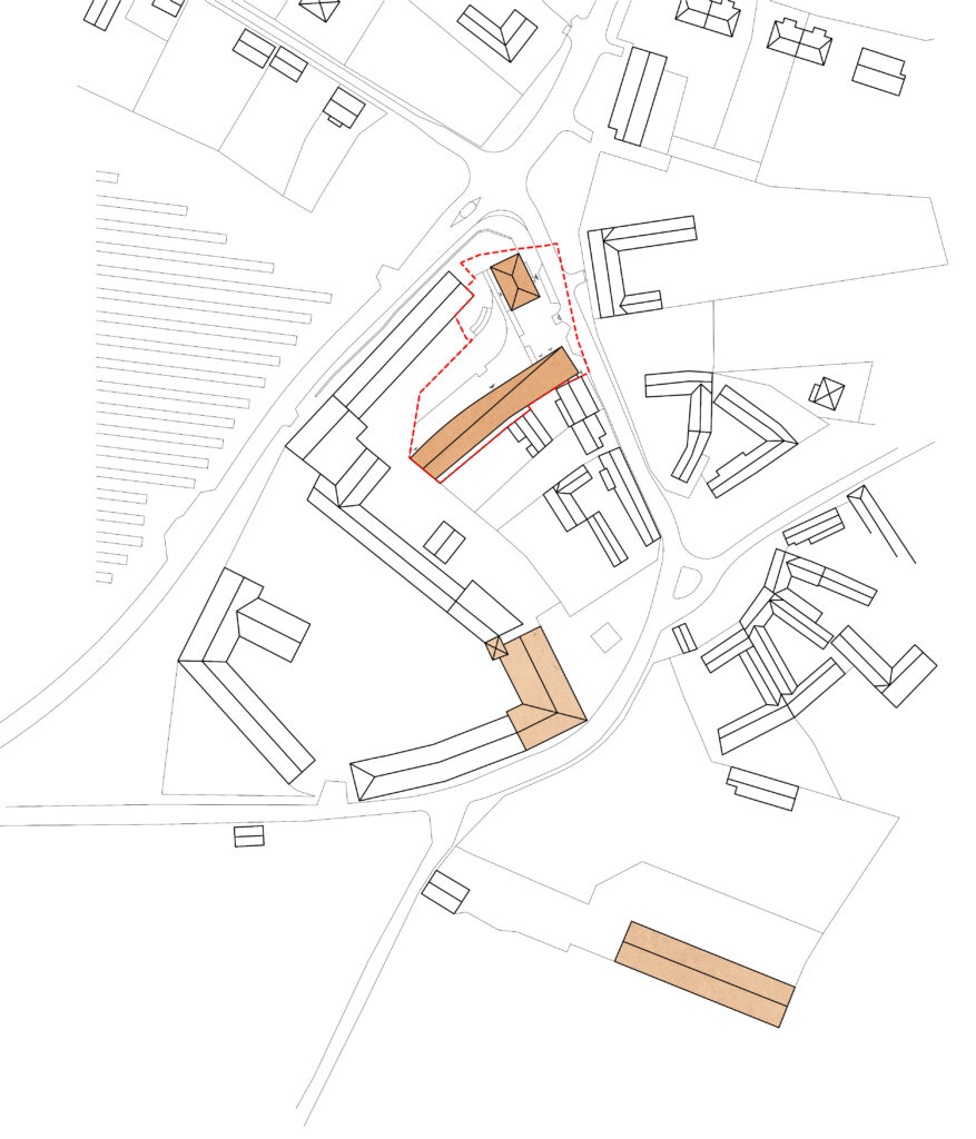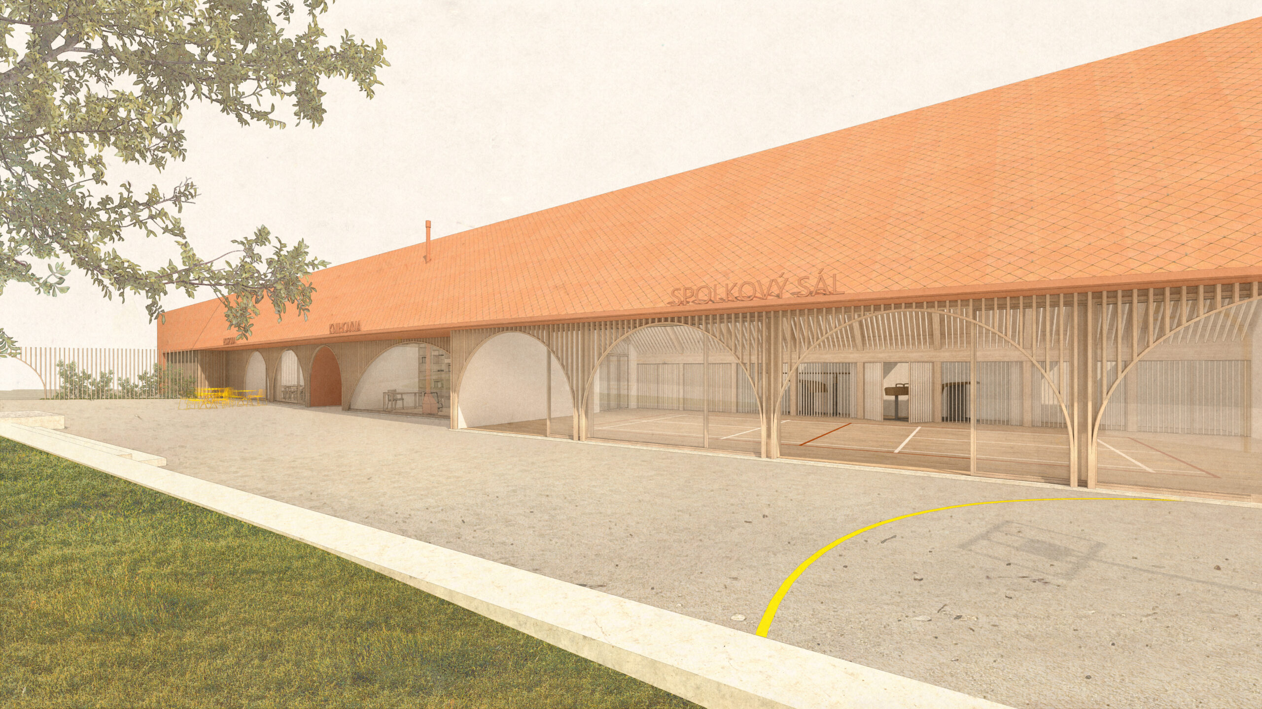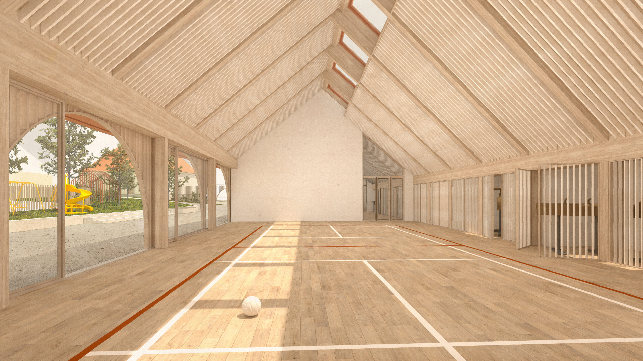The façade then emerges as a transition space, a filter, that connects both realms (interior and exterior).The large glass windows can completely open when the weather allows it or the occasion requires it. The roof protects this transition space, and the wood lamellas filters the light. The arches are not part of the construction logic but rather part of the public building language, to differentiate this building from the private houses in the village. The wood lamellas of the façade turn to become the entry gate and the fences that defines the pedestrian plaza and gardens.