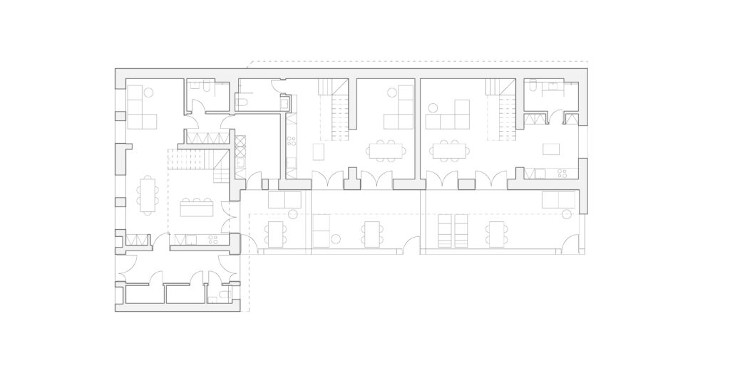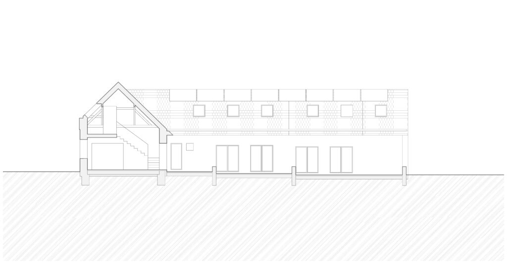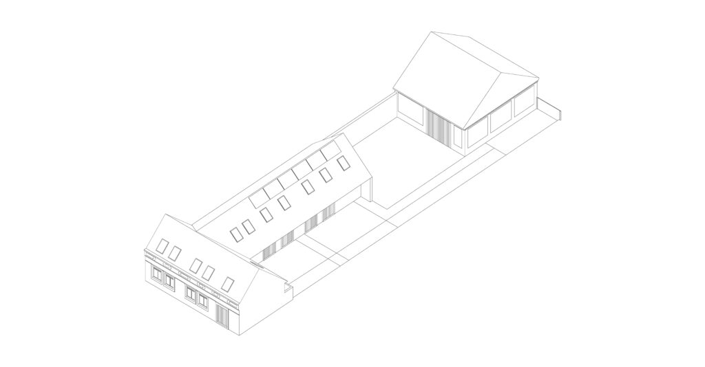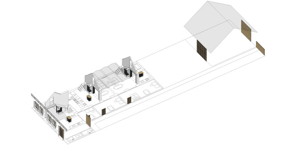 The client’s desire is to divide the main volume into 3 independent units for recreational accommodation for a couple with two daughters. The barn located on the opposite side of the plot becomes a multifunctional space for common activities.